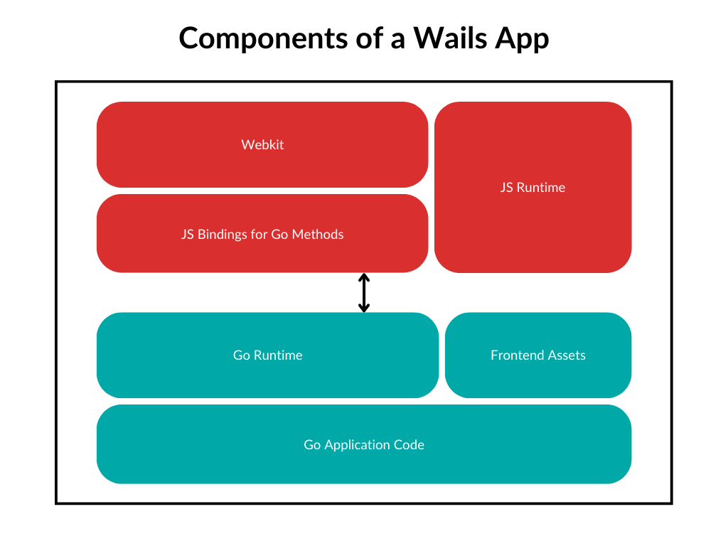 Une application Wails est une application Go standard, avec une interface graphique webkit. La partie Go de l'application se compose du code de l'application et d'une bibliothèque d'exécution qui fournit un certain nombre d'opérations utiles, comme le contrôle de la fenêtre de l'application. Le frontend est une fenêtre webkit qui affichera les ressources graphiques. Une version de la bibliothèque runtime de Javascript est aussi disponible depuis le frontend. Enfin, il est possible de lier les méthodes Go au frontend, et ceux-ci apparaîtront comme des méthodes Javascript qui peuvent être appelées, comme s'il s'agissait de méthodes locales Javascript.