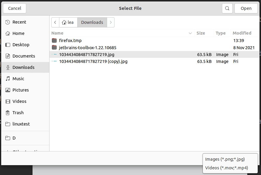 Linuxでは、ダイアログボックスで複数のファイルフィルタを使用できます。 それぞれのFileFiltersは、ダイアログ上で個別のエントリーとして表示されます: